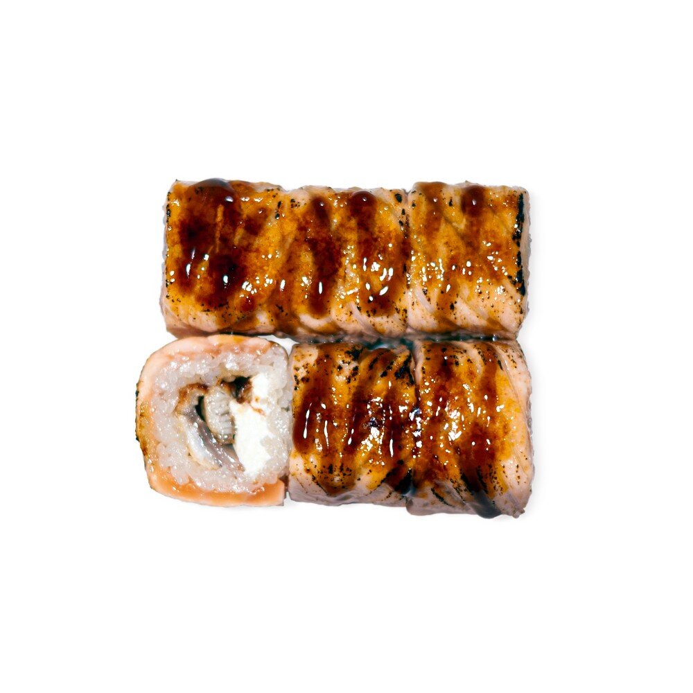 Рис, угорь, лосось, нори, сыр сливочный, майонез, соус унаги