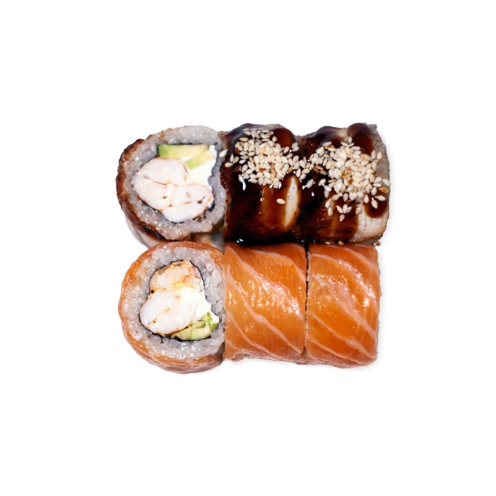 Рис, креветка, лосось, угорь, нори, сыр сливочный, авокадо, соус спайс, соус унаги, кунжут