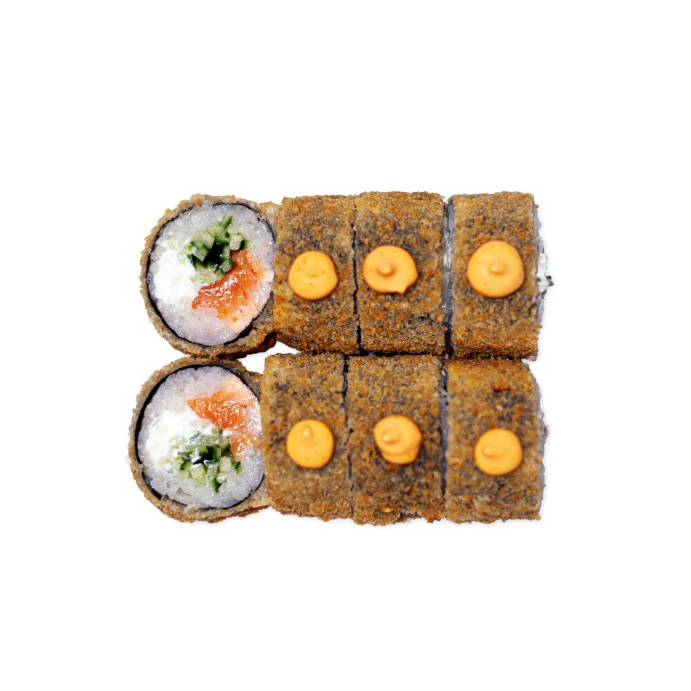 Рис, нори, лосось, сыр сливочный, авокадо, спайс соус, кляр