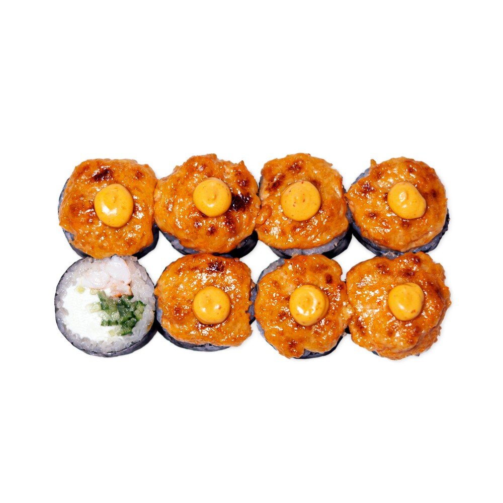 Рис, нори, креветки, сыр сливочный, огурец, сырный для запекания, спайс соус