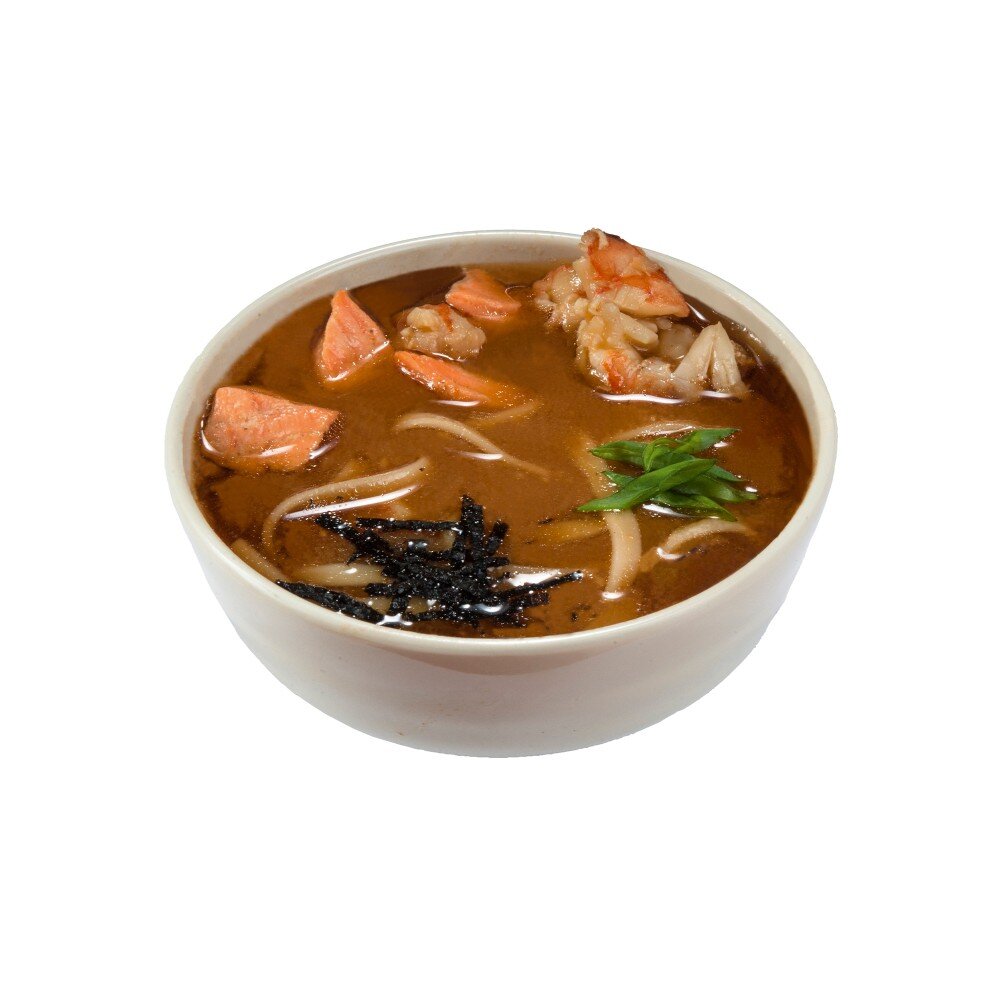 Лосось, креветка тигровая, тофу, вакамэ, соус кимчи, водоросли нори, бульон мисо, удон