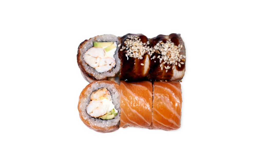 Рис, креветка, лосось, угорь, нори, сыр сливочный, авокадо, соус спайс, соус унаги, кунжут