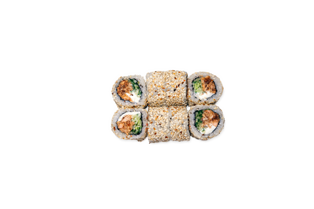 Рис, лосось жареный, нори, сыр сливочный, огурец, унаги соус, кунжут